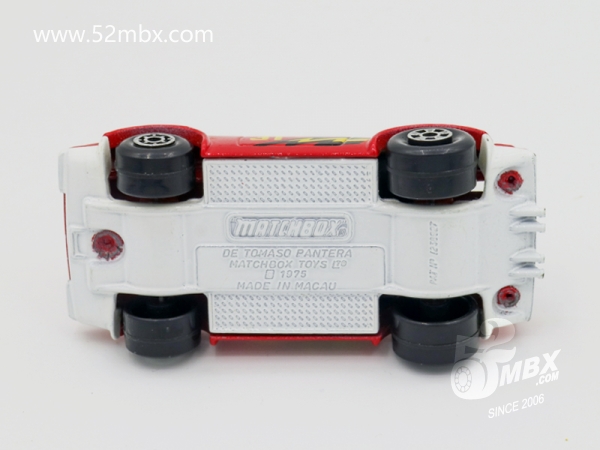 版权年代/Year on base: 1975 Mack #:08-E 比例/Scale: 1:56 底盘未标注/Not marked on base Matchbox标志样式/Logo style: ![]() 制造商信息/Company name: Matchbox Toys Ltd. 其它版本/Other versions: Matchbox Int'l Ltd. 产地/Origin(s): 香港 (Hong Kong) | 澳门环球 (Macau) | 车牌号码/License plate number: California VLO 344 (仅有尾号牌) 其它信息/Others: 英国专利号:PAT No. 1238927 该车是环球早期作品之一,祖先可追溯到1975年由莱斯尼公司生产的LS08-C。1982年被环球官方定名为MB79。合金底盘有避震,尾部发动机暴露在外。第一个版本在澳门生产,底盘铭文为Matchbox Toys Ltd.,取消莱斯尼时期的编号No.8,但在后轮轴外壳上保留了英国专利号PAT No. 1238927。据称1983年该车也在香港制造,底盘铭文修改为Matchbox Int`l Ltd.,之后又在澳门生产,此后即告停产。1987年环球公司将该车还原到未改装前的造型,取消内饰,修改铭文,作为与1-75小比例系列平行的“减配版”Super GT系列的BR39/40发行。减配版一直生产到1991年,此后该车型彻底从火柴盒产品中消失。(数据库基本资料图片提供者:Miketorres,特此表示感谢!) 关于真车: De Tomaso是一家意大利汽车制造商,由阿根廷裔的Alejandro de Tomaso于1959年在Modena成立,主要生产赛车和豪华跑车。“Pantera”一词为意大利语,意为“美洲豹”。该车于1970年由意大利汽车设计公司Ghia设计,搭载福特5.8升Cleveland V8中置引擎,百公里加速时间仅5.5秒。该车采用的ZF传动系统在当时的玛莎拉蒂·宝莱(见MB83)上也得到了应用。事实上,De Tomaso公司在1993年以前一直是玛莎拉蒂品牌的母公司。De Tomaso于2004年申请破产,2009年该公司及品牌被意大利人Gian Mario Rossignolo收购,但命运多舛的De Tomaso因Rossignolo在2012年的被捕入狱而再度停滞。当年曾有传闻称宝马公司有意向收购De Tomaso公司资产以生产宝马汽车。但此后并未有实质性的进展。直到2015年意大利破产法院才允许香港财团Ideal Team Ventures以1,050万欧元收购De Tomaso品牌。2019年由Jowyn Wong设计的双门跑车P72正式亮相,预示该品牌再度复活。 最后更新/Updated: 2023-05-24 | |||