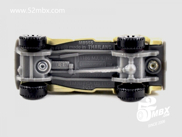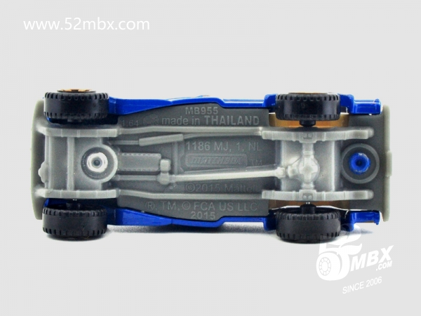 Licensed by FCA US LLC, this model was initially produced by Mattel in Thailand, 2015. Die-cast body, plastic interior together with platform floor, translucent front and rear windshields, plastic base. Due to limited space, the model name is not marked on base.