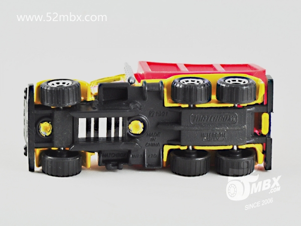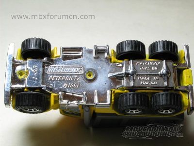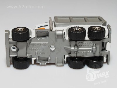 版权年代/Year on base: 1981 / 1991 Mack #:30-E, 23-E 比例/Scale: 1:80 底盘标注/Marked on base Matchbox标志样式/Logo style: ![]() 制造商信息/Company name: Lesney 其它版本/Other versions: Matchbox Toys Ltd. 其它版本/Other versions: Inbrima S.A. 其它版本/Other versions: Matchbox Int'l Ltd. 产地/Origin(s): | 英格兰 (England) | 巴西 (Brazil) | 澳门环球 (Macau) | 珠海永泰 (China - Yongtai) | 南海官窑 (China - Guanyao) | 泰国 (Thailand) | 车牌号码/License plate number: B 1281 其它信息/Others: Intercom City (1991) 该车是莱斯尼的遗作之一,最早于1982年在英格兰制造,1983年起在澳门生产。1990年起,开始在泰国生产,1992至1993年曾在巴西Inbrima S.A.生产。同年珠海永泰制造了一批底盘改装条形码的Intercom City(IC)系列,1998年该车开始在南海官窑制造,其中包括为卡特匹勒公司(Caterpillar)授权美泰生产的Dirt Machines系列套装(38161,Famous Places - Empire State Building,帝国大厦套装[与>、MB353配套];32954,Dirt Movers套装[与MB346配套])所造配车。 与此车共用车身及底盘的其它产品可参考MB019,相似车型还可以参考MB061、MB100、MB106、MB307、MB307B、MB388,以及MB724等。 最后更新/Updated: 2020-03-18 | ||||||||||||||||||||||