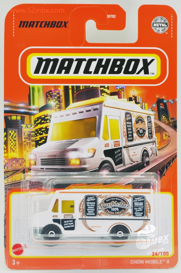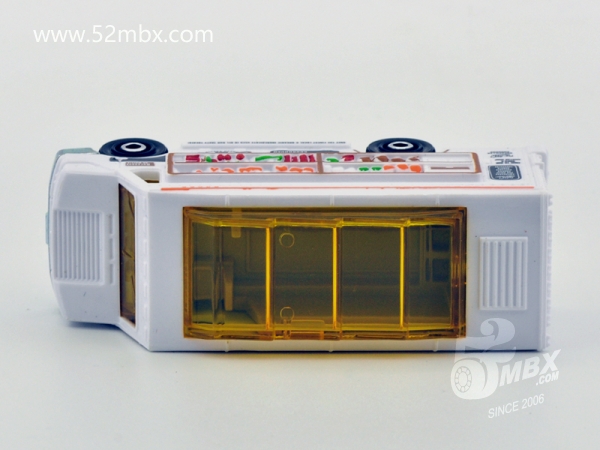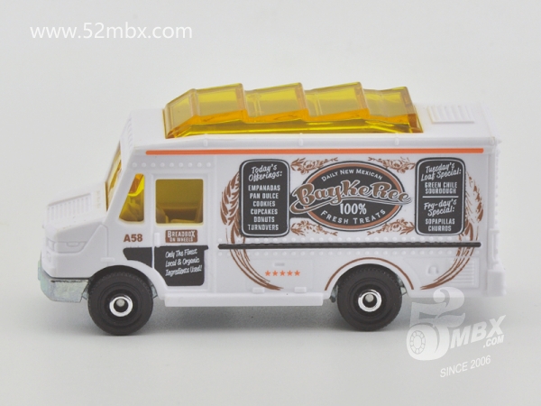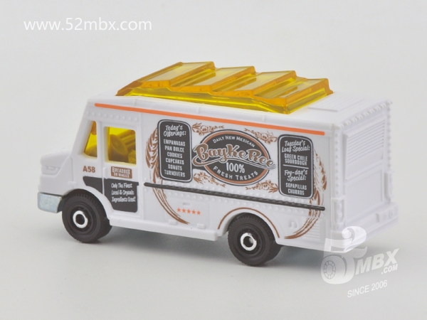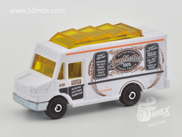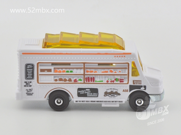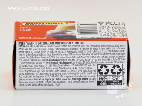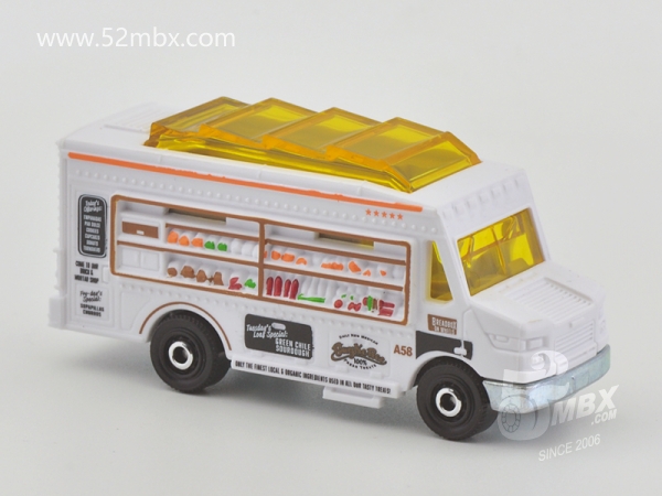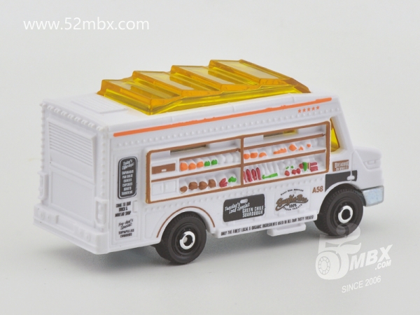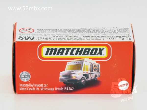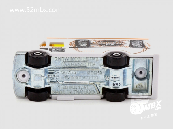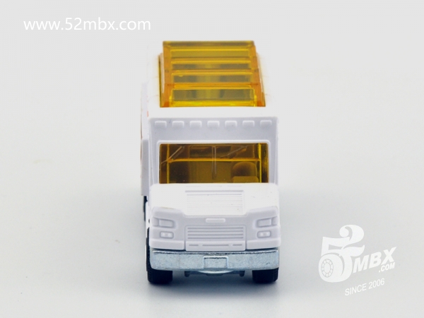 版权年代/Year on base: 2020 Mack #:24 比例/Scale: 无/None 底盘编号/Number on base: MB1250, GVX12 Matchbox标志样式/Logo style: ![]() 制造商信息/Company name: Mattel 1186 MJ, 1, NL 产地/Origin(s): 泰国 (Thailand) | 该车由美泰火柴盒团队原创,最早于2020年底在泰国生产,首版作为2021年度24号发行。车身造型介于MB787/MB813和MB889/MB999之间,但彼此并没有任何共用零件。塑料车身整体,车头引擎盖及前脸造型类似MB787/MB813,但较之更长一些。货架位于右侧并与车身一体注塑成型。车顶有类似MB889/MB999的五连波浪形透明天窗,但天窗位置相对靠前,因而与之并非同一零件。内饰包括驾驶座和车厢地板,尾部车门不可开。合金底盘。 最后更新/Updated: 2021-10-14 | |||