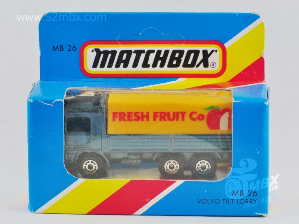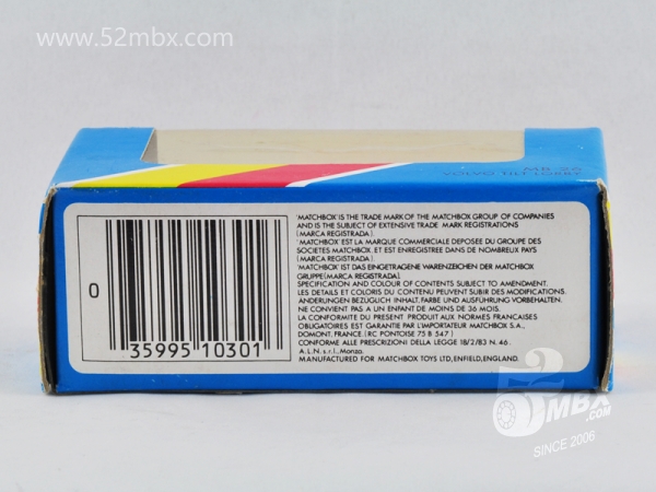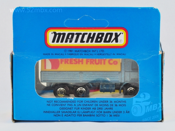 涂装序号/Variation #: 003 | ![]() 制造商信息/Company name: Matchbox Int'l Ltd. MB标志样式/Logo style: ![]() 产地/Origin(s): 澳门环球 (Macau) 版权年代/Year on base: 1984 1985年7月仅在欧洲地区发行的年度26号,总第3种涂装,首个澳门版,也是最后采用水果图案的版本。 图片提供者/Picture by: chenly75,上传时间/Updated: 2017-06-09