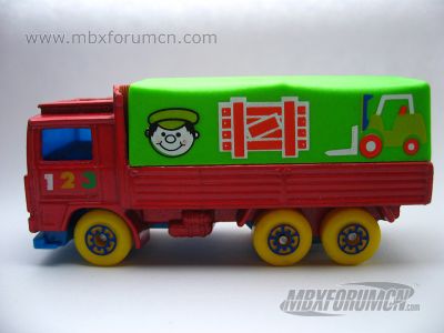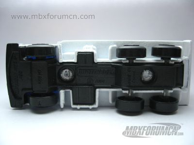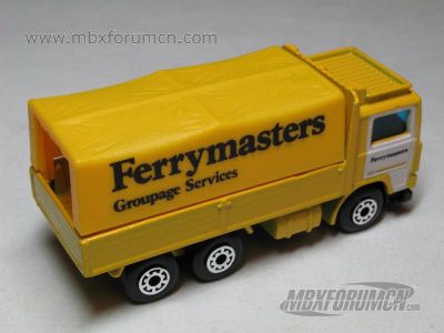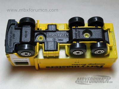 版权年代/Year on base: 1984 Mack #:26-F, 49-G 比例/Scale: 1:90 底盘标注/Marked on base Matchbox标志样式/Logo style: ![]() 制造商信息/Company name: Matchbox Int'l Ltd. 产地/Origin(s): | 英格兰 (England) | 澳门环球 (Macau) | 上海环球 (China - SUTC) | 车牌号码/License plate number: KCF 17W (仅有前号牌) 该车是环球中期产品之一,最早于1984年在英格兰制造,1985年下半年开始在澳门生产。车身主体部分来源于MB26和MB35,但作了显著修改。后单桥改为双桥,且车身平板边缘增加了栏板,并配有单独制作的刻拆卸塑料篷(与同时期CY系列中的篷车上的部件相似,但长度仅有一半)。最早的版本为金属蓝色车身,Fresh Fruit Co.涂装(英格兰)。1986年开始出现黄色Ferrymaster涂装,次年3月开始在上海环球生产,成为上海环球率先投产的涂装。该涂装仅出现了4个月即被白色Federal Express(FedEx联邦快递老标志)所替代。与同时期的其它品种不同,该车并不长寿,已知的官方涂装也不多,但其产量较高,在中国火柴盒迷心目中具有很高地位。该车最终于2000年前后停产。之后未见有其他官方发行的新版本。 与该车有关的其它车型可参考:MB26、MB35、MB148、MB315、MB389和MB395(未生产)。 最后更新/Updated: 2020-02-04 | |||||||||||||||||||