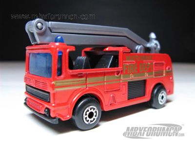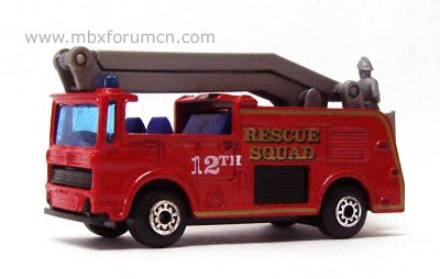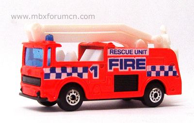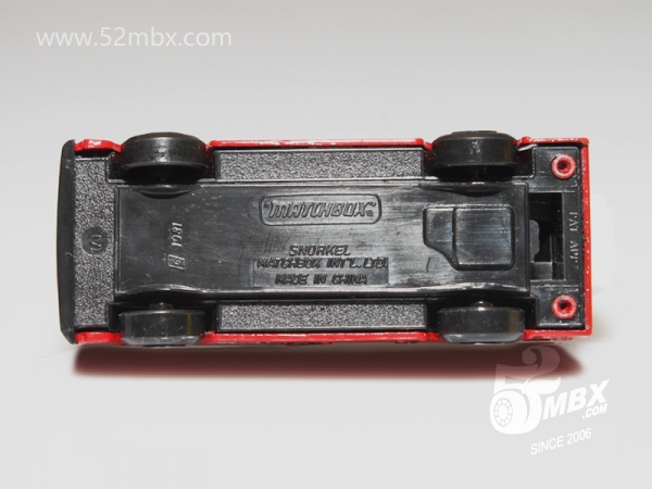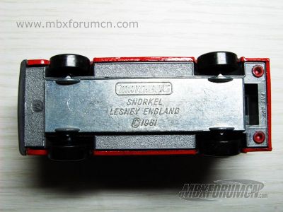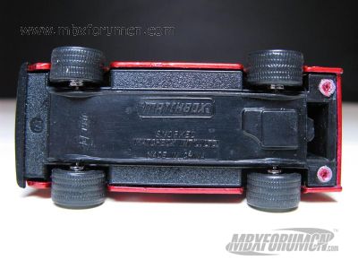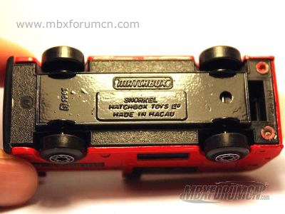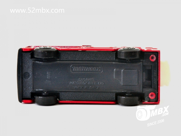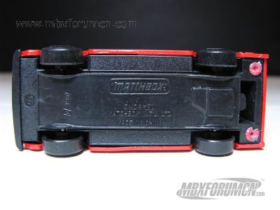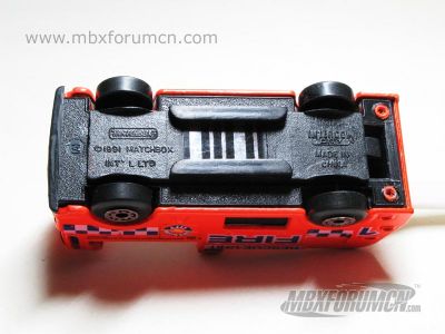 涂装序号/Variation #: 026 | ![]() 制造商信息/Company name: Matchbox Int'l Ltd. MB标志样式/Logo style: ![]() 产地/Origin(s): 上海环球 (China - SUTC) 版权年代/Year on base: 1981 1998年发行总第26种涂装,红底金色条MBX Fire Dept. 图片提供者/Picture by: chenly75,上传时间/Updated: 2012-04-20