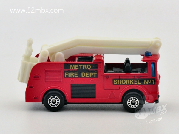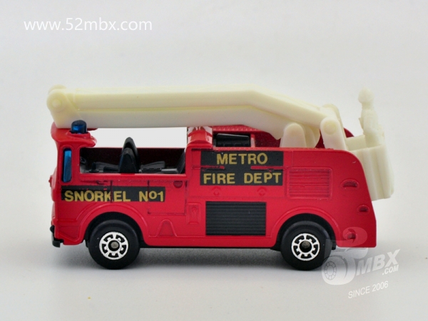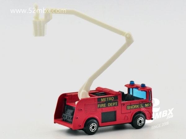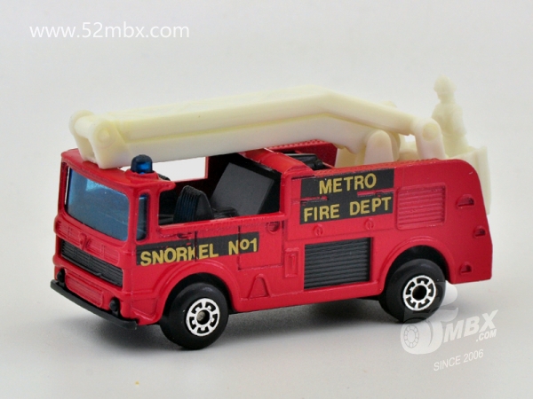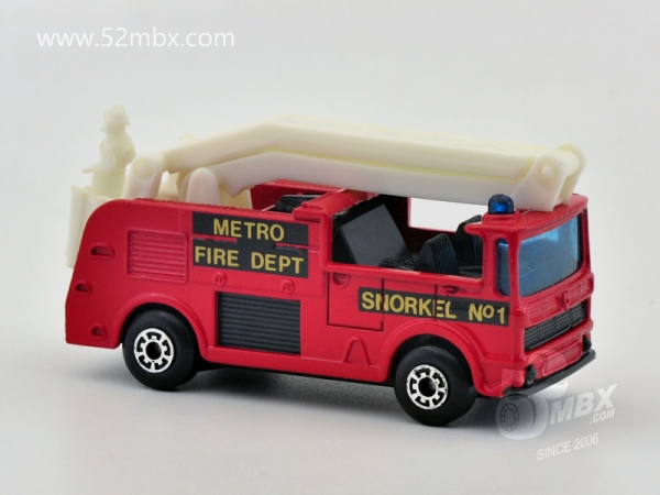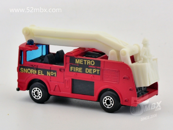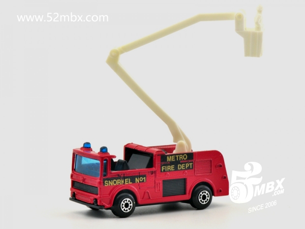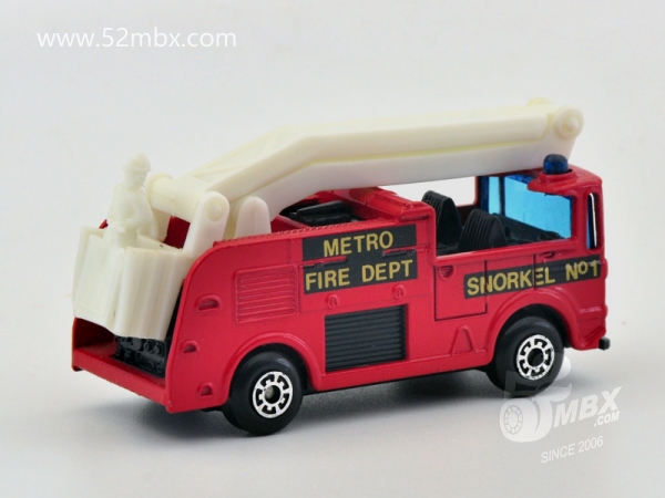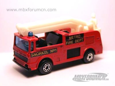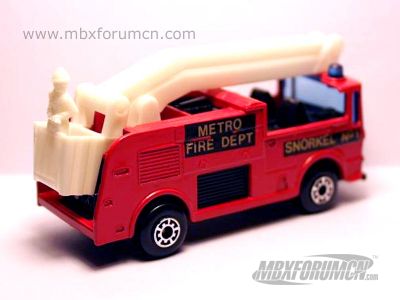 涂装序号/Variation #: 009 | ![]() 制造商信息/Company name: Matchbox Int'l Ltd. MB标志样式/Logo style: ![]() 产地/Origin(s): 上海环球 (China - SUTC) 版权年代/Year on base: 1981 1986年发行的年度63号,总第9种涂装:Metro Fire Dept. Snorkel No.1 图片提供者/Picture by: chenly75,上传时间/Updated: 2012-04-20