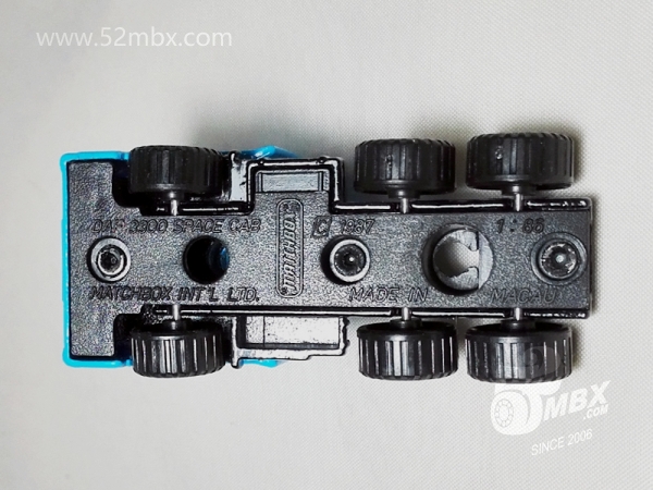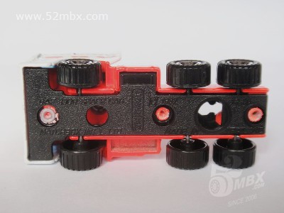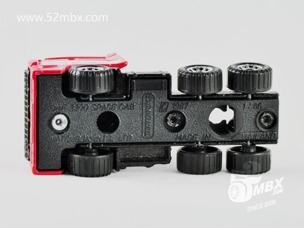 版权年代/Year on base: 1987 Mack #:15-L 比例/Scale: 1:86 底盘标注/Marked on base Matchbox标志样式/Logo style: ![]() 制造商信息/Company name: Matchbox Int'l Ltd. 其它版本/Other versions: Mattel, Inc. 产地/Origin(s): 澳门环球 (Macau) | 南海官窑 (China - Guanyao) | 泰国 (Thailand) | 该车为环球中期产品,最早于1987年在澳门生产。塑料底盘无避震,无内饰。该车在环球时期没有单独销售,主要为当时的CY21、CY22、CY23、CY24、CY25、CY26等多个Convoy(CY)以及相关的Team Convoy(TC)系列担任牵引任务。1990年开始在泰国生产。1997年该车开始在南海官窑制造,此时著名车型有CY7E(BP涂装)油罐车、CY25麦当劳、可口可乐涂装等,同时南海官窑也生产了一款MB183盒装单个车辆的版本(Mack#:MB15-L)。2000年停产。 与该车相似的其他品种可参考MB340。 1-75系列中相关Convoy拖头还可以参考:MB045、MB103、MB106、MB147、MB202、MB214、MB432。 最后更新/Updated: 2021-11-25 | ||||||||||||||||||||||||||||||||||||||||||||||