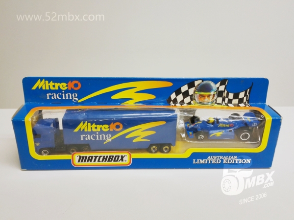 涂装序号/Variation #: 044 | ![]() 制造商信息/Company name: Matchbox Int'l Ltd. MB标志样式/Logo style: ![]() 产地/Origin(s): 泰国 (Thailand) 版权年代/Year on base: 1987 1993年12月仅在澳洲发行的TC111套装组建之一,总第44种涂装:Mitre10 Racing。 图片提供者/Picture by: chenly75,上传时间/Updated: 2021-11-30