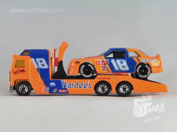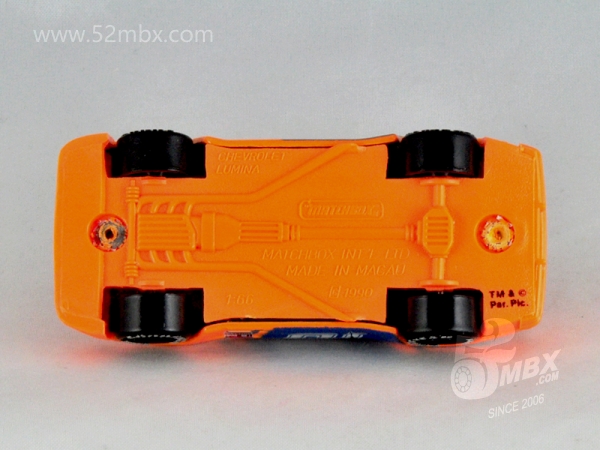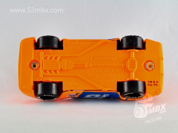 版权年代/Year on base: 1990 Mack #:54-G 比例/Scale: 1:66 底盘标注/Marked on base Matchbox标志样式/Logo style: ![]() 制造商信息/Company name: Matchbox Int'l Ltd. 产地/Origin(s): 澳门环球 (Macau) | 泰国 (Thailand) | 车牌号码/License plate number: LUMINA (仅有前号牌) 其它信息/Others: TM © PAR.PIC. (1990年7月);TM & © PAR.PIC. (1990年9月) 该车是环球晚期产品之一,最早于1990年7月在澳门生产。车身整体造型来自环球研发的MB185,但前脸整体与塑料底盘以及后围均作了较大修改。B柱以后的侧窗较MB185相同位置要大许多。前挡风有四根蚀刻护栏,而后挡风仅有两根,固特异赛车轮有避震。相传当年为配合派拉蒙电影公司推出的影片“Days of Thunders”(《雷霆战记》)而推出的DT系列促销品。但由于时间仓促,环球没能在第一时间推出真正的雪弗莱·罗米那赛车模型,而是通过上述基于MB185的修改(更接近当时的别克·君威赛车)才得到了授权。与此同时,环球还通过协议,采购Racing Champions生产的斯托克场地赛车模型,换上相同的涂装并以火柴盒包装的板卡发行。同年8月,环球推出的MB221消除了这种尴尬,该车很快从市场上消失。其最后一次复出也仅仅是昙花一现,该车的最后一个版本于1992年在泰国生产,之后就彻底消失。 最后更新/Updated: 2020-02-10 | ||||||||||