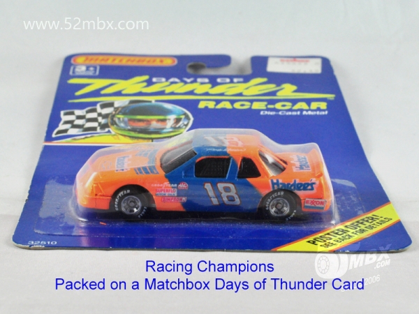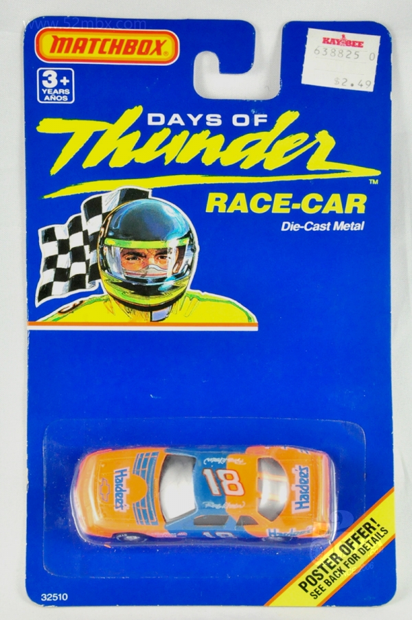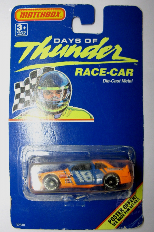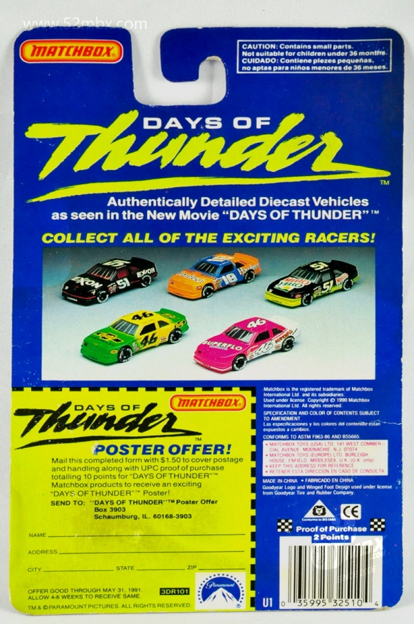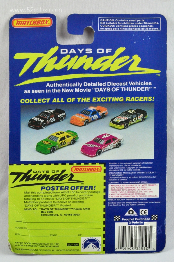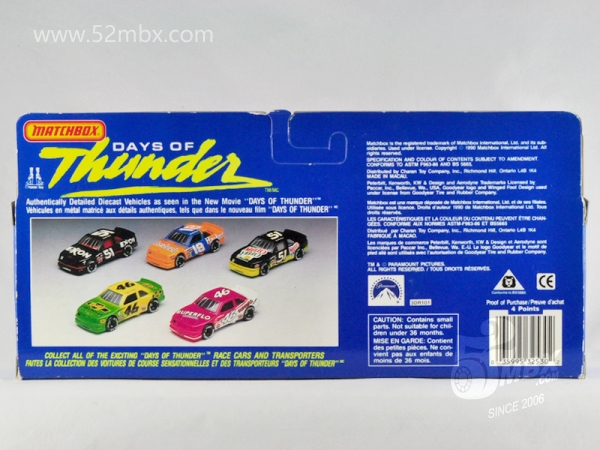 涂装序号/Variation #: 008b | ![]() 制造商信息/Company name: Matchbox Int'l Ltd. MB标志样式/Logo style: ![]() 产地/Origin(s): 澳门环球 (Macau) 版权年代/Year on base: 1990 1990年7月在美国发行的“Days of Thunders”(《雷霆战记》)而推出的DT系列之一,总第8b种涂装,单卡版。 图片提供者/Picture by: chenly75,上传时间/Updated: 2025-07-24