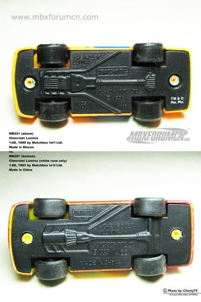版权年代/Year on base: 1993 比例/Scale: 1:66 底盘标注/Marked on base Matchbox标志样式/Logo style: ![]() 制造商信息/Company name: Matchbox Int'l Ltd. 产地/Origin(s): 珠海永泰 (China - Yongtai) | 该车是太空(Tyco)时代中期产品,最早于1994年在珠海永泰生产。目前已知仅有珠海永泰版。塑料底盘有避震,除少数版本外,大多采用固特异橡胶轮。与之前在1990年制版的两款鲁密娜车型相比,更接近MB221的造型,但又与之不同,主要区别在于以下几个方面: 前脸: 侧面: 底盘: 267的底盘显得粗糙,而且Matchbox商标也不规整(这个系列的所有White Rose版本,除MB283以外都有这个毛病) 然而就是这款车,被White Rose(WR)白玫瑰礼品公司用作94年WR系列之二发行,还有4个品种入选当年的Team Convoy(TC)系列。该车曾一度发行了30种涂装。1997年之后未见有其他新版本发行。 最后更新/Updated: 2020-02-10 | |||