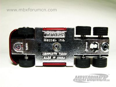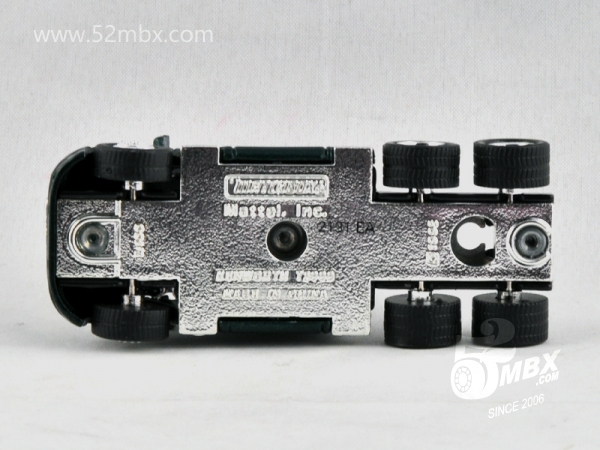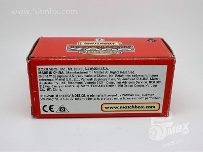 版权年代/Year on base: 1998 Mack #:13-G 比例/Scale: 1:100 底盘标注/Marked on base Matchbox标志样式/Logo style: ![]() 制造商信息/Company name: Matchbox Int'l Ltd. 其它版本/Other versions: Mattel, Inc. 产地/Origin(s): 南海官窑 (China - Guanyao) | 该车是美泰早期产品之一,最早于1999年在南海官窑生产。塑料底盘无避震,精品橡胶车轮,有内饰,有倒车镜。首版出现在当年发行的First Edition(FE)精品系列,该系列源自1997年的Inaugural Collection [IG]“新开端”系列,其中包括一台红/黑色精品版和一台相同工艺但未上色的清漆版。1999年起该车在许多精品拖车系列中担当牵引任务,其中包括2000年发行的Matchbox Collectibles“可口可乐环游世界”主题之美国篇。2001年该车停产。与该车有关的其他品种可参考取消倒车镜的MB432。 注:有记载称该车早期有很少批量的底盘铭文中制造商信息为Matchbox Int`l Ltd.,但绝大多数标注为Mattel, Inc.。 最后更新/Updated: 2020-03-06 | |||||||||||||||||||