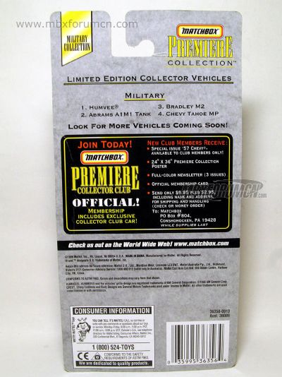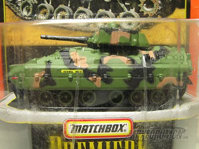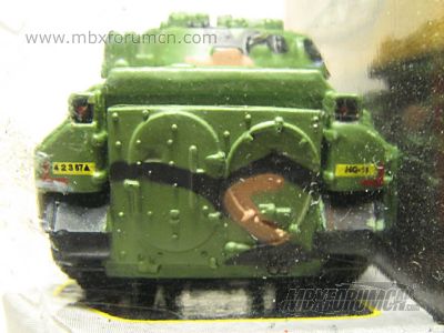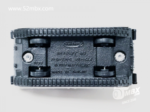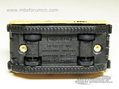 版权年代/Year on base: 1997 Mack #:47-G 比例/Scale: 1:98 底盘标注/Marked on base Matchbox标志样式/Logo style: ![]() ![]() 制造商信息/Company name: Matchbox Int'l Ltd. 其它版本/Other versions: Mattel, Inc. 产地/Origin(s): 上海环球 (China - SUTC) | 南海官窑 (China - Guanyao) | 泰国 (Thailand) | 该车是美泰早期产品之一,最早于1998年在上海环球生产。固定蚀刻塑料履带与底盘一体,底部有四个隐藏的假轮,无避震。合金炮塔可旋转,固定角度塑料炮管。1999年该车开始在南海官窑生产。2002年为纪念“911”恐怖袭击事件的救援行动,美泰公司制作了一个集消防车(MB229)、警车(MB460)、装甲车(MB323)和救护车(MB299)于一体的“True Heroes”(真实英雄)主题礼盒。2003年美泰公司对该车进行了再版,修改制造商信息和火柴盒商标样式。2005年,该车开始在泰国生产。2006年开始充入当年新版的BattleKings(BK战斗之王)系列。2007年以后未见有新版本发行。与该车相关的其他产品可参考美泰公司于2001年发行的Matchbox Collectibles收藏级产品同款精品版。 最后更新/Updated: 2020-03-02 | ||||||||||||||||