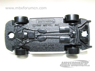 版权年代/Year on base: 1999 Mack #:17-I, 68-P 比例/Scale: 1:61 底盘标注/Marked on base Matchbox标志样式/Logo style: ![]() ![]() 制造商信息/Company name: Mattel, Inc. 产地/Origin(s): 南海官窑 (China - Guanyao) | 该车由福特汽车公司授权美泰生产,最早于1999年出现在当年的First Edition(FE)精品系列中,首版为一款红色精品车与一款相同工艺但未上色的清漆版。2001年该车曾出现在当年发行的美国反毒品宣传活动(D.A.R.E.)系列中,但未加装警灯。稍后一款红蓝条配以福特野马图案的35周年纪念车在美国发行。该版本被认为是该车最后一次使用环球时代圆角长方形火柴盒商标。此后该车底盘改版,并作为多种促销定制版Color Comp Inc.(CCI)在美国发行。该车最后一次正式发行是在2007年,一款金属红色镶金条的版本在美国发行,此后未见有其他官方发行的新版本。与该车有关的其他车型可参考MB368、MB460、MB509以及1999年专为“赛百味”定制的玩具。 最后更新/Updated: 2020-02-19 | ||||||||||