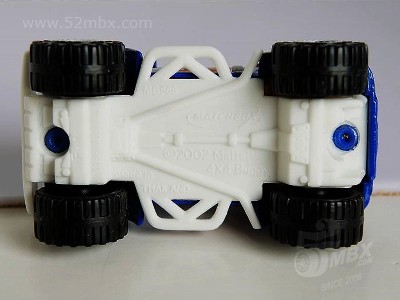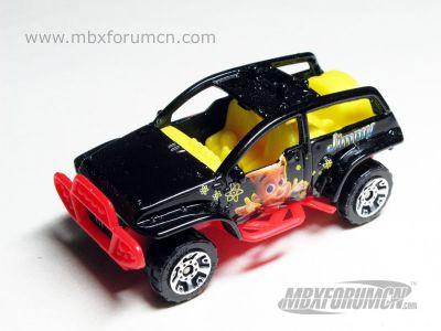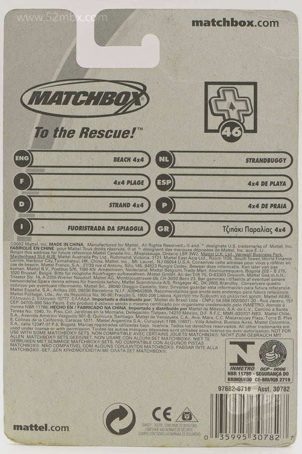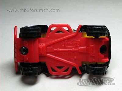 版权年代/Year on base: 2002 Mack #:46-K 比例/Scale: 无/None 底盘编号/Number on base: MB569 Matchbox标志样式/Logo style: ![]() 制造商信息/Company name: Mattel, Inc. 其它版本/Other versions: Mattel 1186 MJ, 1, NL 产地/Origin(s): 南海官窑 (China - Guanyao) | 泰国 (Thailand) | 该车由美泰公司原创,最早于2003年在南海官窑生产。塑料底盘无避震。前保险杠下部镂空,无车窗,后车顶敞开,车厢后部有与内饰相连的塑料备胎。该车自发行之日起,基本只供应美国市场。曾多次入选五件套(5-Pack)及PlaySet(场景套装)。2005年起,该车开始在泰国生产,但仍然只供应美国市场。2007年美泰火柴盒团队以该车为基础,修改模具后为美国地区的汉堡王®餐厅定制了一批随餐玩具。2009年以后曾一度停产。2013年该车再度以单卡包装上市,为应对欧盟史上最严厉的产品责任法,美泰公司在该车底盘上加注了荷兰分公司地址及MB569编号。 最后更新/Updated: 2020-03-07 | |||||||||||||