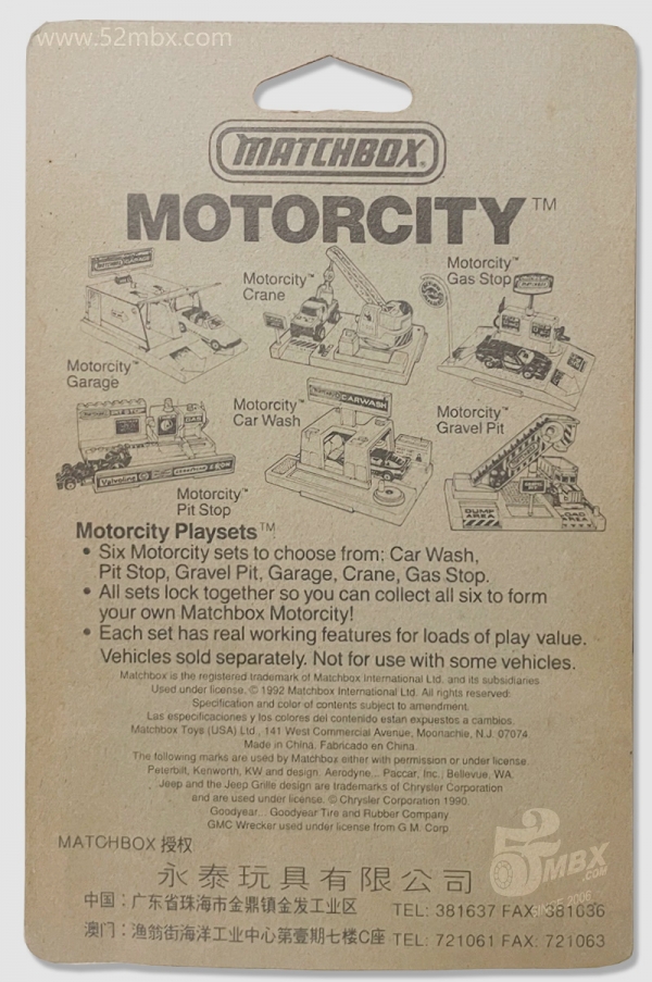 图片提供者/Picture by: FLyYYY,上传时间/Updated: 2026-04-13  板卡背面:印有火柴盒与永泰玩具之间的授权关系,此时环球火柴盒尚未被Tyco公司收购。图片由FLyYYY提供,特此感谢!