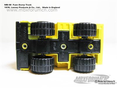 版权年代/Year on base: 1976 Mack #:58-C 比例/Scale: 1:140 底盘未标注/Not marked on base SuperFast标志:有/Yes 底盘编号/Number on base: 58 Matchbox标志样式/Logo style: ![]() 制造商信息/Company name: Lesney 产地/Origin(s): | 英格兰 (England) | 巴西 (Brazil) | 该车是莱斯尼的遗作之一,并被环球官方定名为MB058。最早在英格兰生产,塑料底盘,越野车大轮无避震,车身及料斗均为合金,自卸翻斗底部与车身的连接轴之间有塑料缓冲装置,防止合金翻斗快速扣向车头。1978年曾经在巴西制造过,1982年停产。 1989年环球公司复刻了该车,取消翻斗转轴上的塑料缓冲装置,并改编号为MB209;2006年美泰公司再度复刻了该车,改合金车厢为塑料,同时改编号为MB710B。 与该车相关的其他品种还有MB140以及MB314以及MB840。 最后更新/Updated: 2020-03-18 | ||||||||||