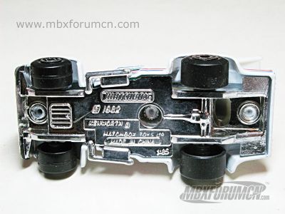 涂装序号/Variation #: 015 | ![]() 制造商信息/Company name: Matchbox Toys Ltd. MB标志样式/Logo style: ![]() 产地/Origin(s): 珠海永泰 (China - Yongtai) 版权年代/Year on base: 1982 1991年9月发行的MultiPack套装组件之一,总第15种涂装,底盘比例标注在中间偏下部位。 图片提供者/Picture by: chenly75,上传时间/Updated: 2012-04-20