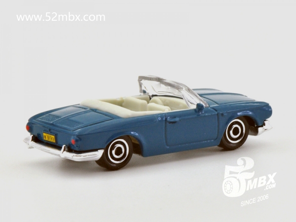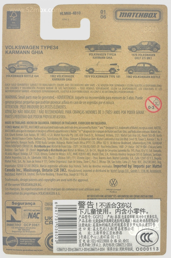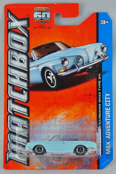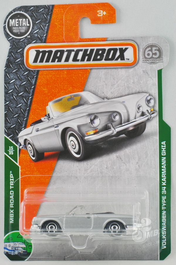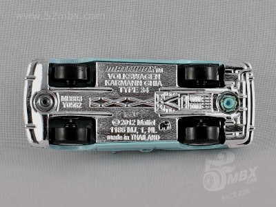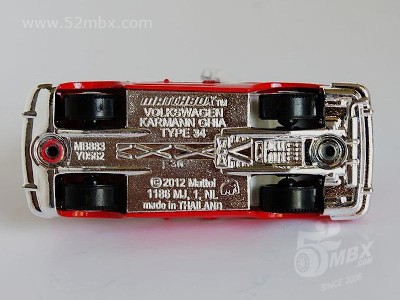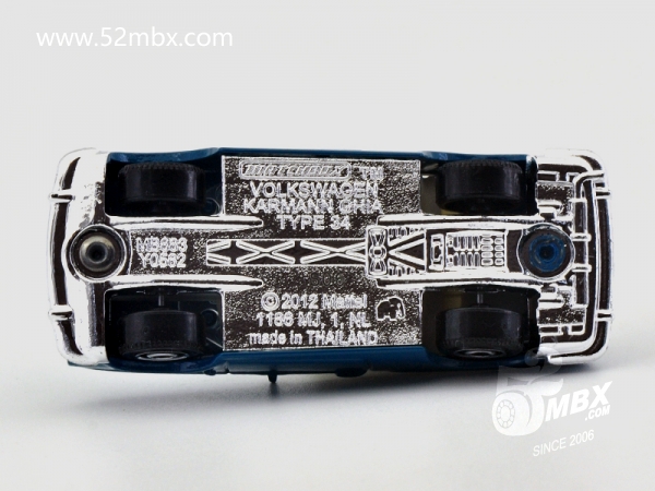 版权年代/Year on base: 2012 比例/Scale: 无/None 底盘编号/Number on base: MB883, Y0562 Matchbox标志样式/Logo style: ![]() ![]() 制造商信息/Company name: Mattel 1186 MJ, 1, NL 产地/Origin(s): 泰国 (Thailand) | 该车由大众汽车授权美泰公司制造,最早于2013年在泰国生产。敞顶,塑料底盘无避震,底盘标注有亚洲象标志。该车的四盏头灯为合金车身的一部分。由于该车型在1:64级别的模型较少见,火柴盒制作该车模型得到了大多数车迷的好评。该车首版底盘采用的火柴盒商标样式仅出现于2012-2013年开发的部分产品上。2014年以后该车曾一度停产。2023年美泰公司对该车底盘商标样式做了修改,并作为当年的“大众系列”第1号发行。 关于真车: 卡尔曼-杰亚“Karmann Ghia”是意大利都灵著名的设计事务所Carrozzeria Ghia与德国Osnabrück著名车身设计专家Wilhelm Karmann的组合。大众汽车的首个Karmann Ghia车型是Type 14(MB760),最早于1955年问世。该车量产达20年之久,截止1974年,共生产了445,000辆。1961年,第二台大众Karmann Ghia发布,被称为Type 34 (T34)。该型号是在大众1500(Type 3)系列(见MB1135)的基础上搭载更宽大的引擎,造型方面较Type 14更为硬朗,并且配置了许多标准功能。在1962至1969年的八年间,T34是大众汽车当时最昂贵的车型。截止1969年,该车只生产了42,505辆,产量仅为前代T14的10%。T34从未正式出口到美国市场。 该车的敞篷型是在1961年设计出炉的,在1962年10-11月间,共生产了15辆,但大众汽车很快终止了该型号的生产。在这15辆孤品中,仅有6辆目前还幸存,并且都保存在德国。 仅有2%的产品配有电动天窗,该车是第二种配有电动天窗的车型。在1961年,该车造型颇为前卫,具有特殊的前鼻、细小的立柱以及宽大的透明驾驶舱。如今在当时量产的42,000辆T34中有约2500辆幸存。车身生锈是普遍现象,而缺乏零配件使得恢复和修理费用相当高昂。T34的国际车主联盟“T34 World” (www.T34World.org) 在德国庆祝了T34车型诞生50周年。有154辆T34参加了周末活动,并刷新了该车型一次参加聚会的历史记录。(真车部分文字资料翻译自美国资深Type34收藏家Lee Hedges的文章。) 最后更新/Updated: 2023-09-05 | |||||||||||||||||||