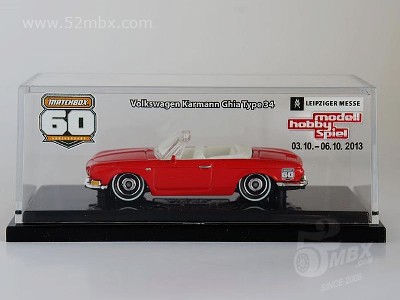 涂装序号/Variation #: 002 | ![]() 制造商信息/Company name: Mattel 1186 MJ, 1, NL MB标志样式/Logo style: ![]() 产地/Origin(s): 泰国 (Thailand) 版权年代/Year on base: 2012 2013年3月-6月在德国莱比锡举行的玩具展览会特制版涂装,含有底座和水晶展示盒,属于火柴盒60周年纪念系列产品之一。 图片提供者/Picture by: Hasasin,上传时间/Updated: 2013-10-12