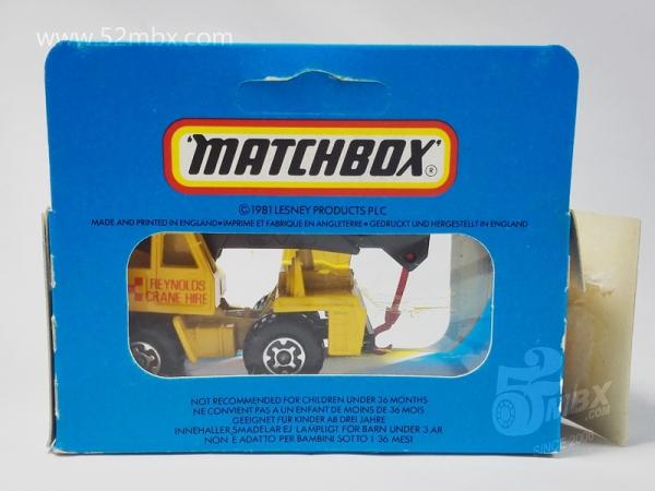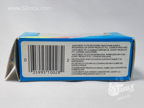 包装盒背面,1981年版权,制造商名称:Lesney Products PLC,英格兰制造并印刷。