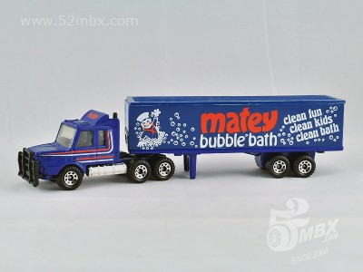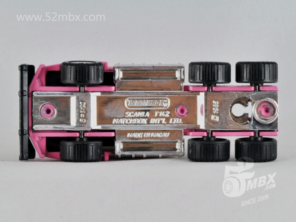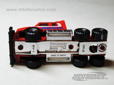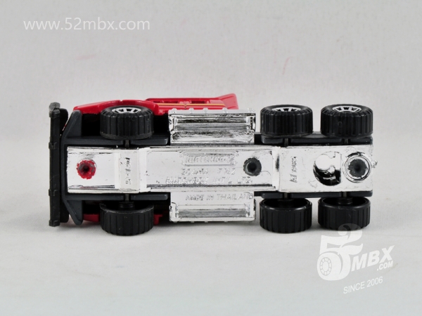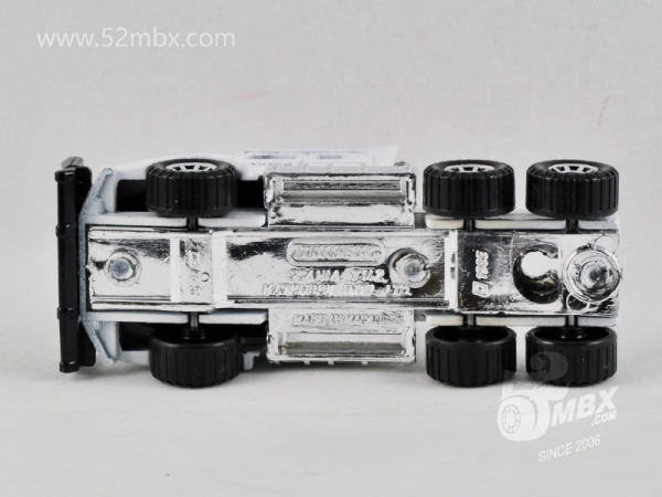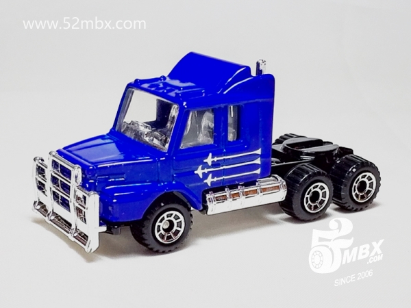 版权年代/Year on base: 1985 / 1983 Mack #:08-F, 71-E 比例/Scale: 1:90 底盘标注/Marked on base Matchbox标志样式/Logo style: ![]() 制造商信息/Company name: Matchbox Int'l Ltd. 其它版本/Other versions: Mattel, Inc. 产地/Origin(s): 澳门环球 (Macau) | 南海官窑 (China - Guanyao) | 泰国 (Thailand) | 该车是环球中期产品之一,最早于1985年在澳门生产,塑料镀铬底盘无避震,右舵操控。除1985年和1987年曾发行过年度单卡以外,该车基本仅在Convoy(CY)系列套装中发行,曾作为CY4B、CY16、CY17、CY18、CY20B、CY23等产品的牵引车。1990年该车开始在泰国生产,继续配套CY803等多个CY套装。1991年该车还曾在CY806套装中出现,仅供荷兰市场。1997至1998年,该车曾在澳洲市场以CY104的澳洲足球大联盟(AFL)促销品红及一时。1999年,美泰公司对该车进行了复刻,修改制造商信息,并开始在南海官窑制造。2002年该车从市场上消失。 该车后继相同车型,可参考美泰复刻的Premiere精品系列之MB341。 1-75系列中相关Convoy拖头还可以参考:MB045、MB103、MB106、MB183、MB202、MB214、MB432。 (数据库基本资料图片提供者:wzlovely87,特此表示感谢!) 最后更新/Updated: 2020-03-06 | ||||||||||||||||||||||||||||||||||||||||||||||