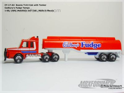 涂装序号/Variation #: 025 | ![]() 制造商信息/Company name: Matchbox Int'l Ltd. MB标志样式/Logo style: ![]() 产地/Origin(s): 澳门环球 (Macau) 版权年代/Year on base: 1985 1988年10月在英国发行的CY-17Cadbury's Fudge罐车拖头,总第25种涂装。 图片提供者/Picture by: chenly75,上传时间/Updated: 2012-04-20