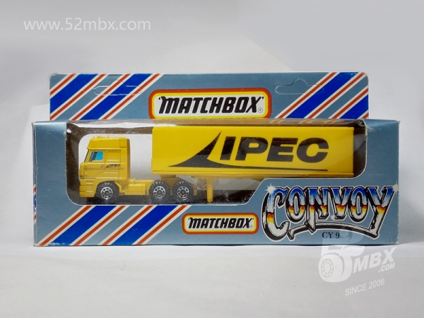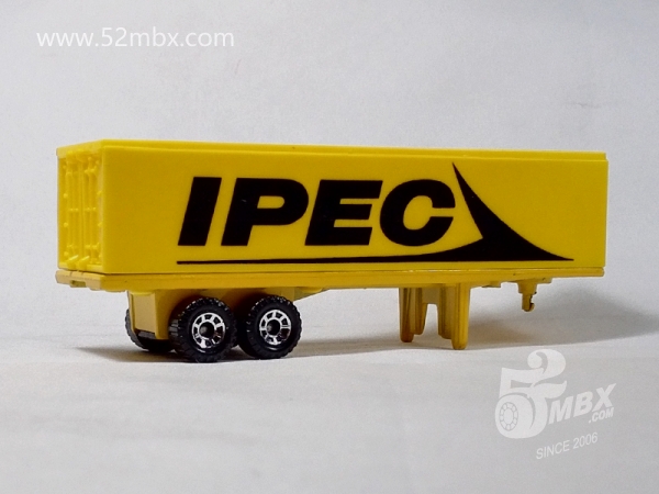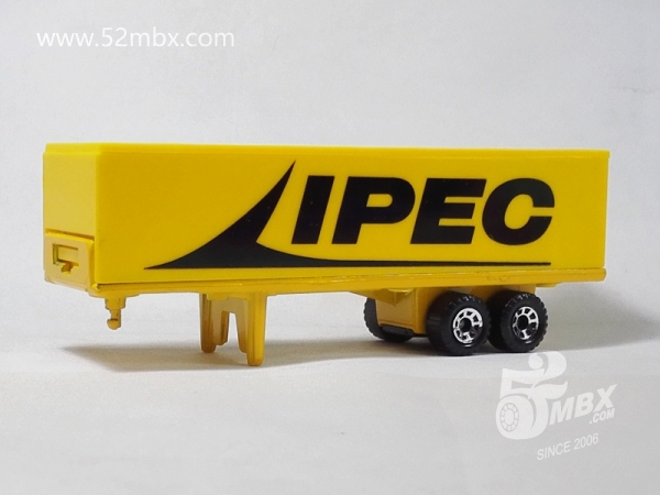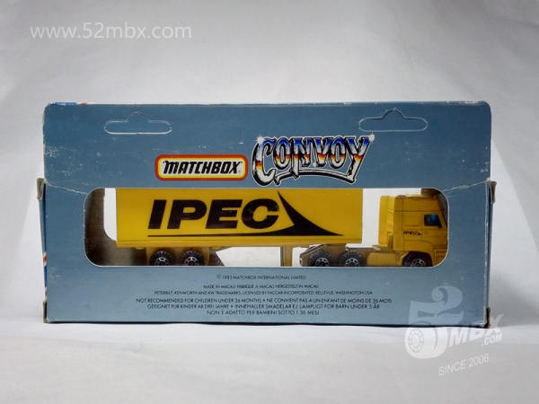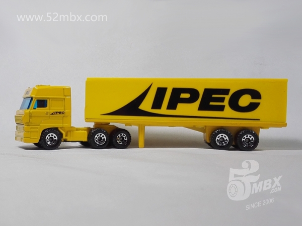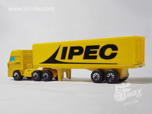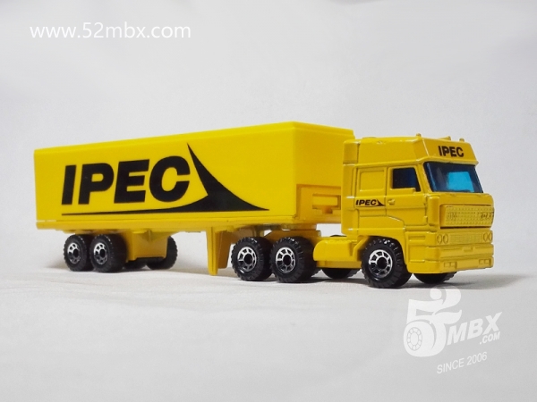 ![]() 图片提供者/Picture by: chenly75 最后更新/Updated: 2017-07-01 车头/Cab: MB183 DAF 3300 Space Cab 挂车/Trailer: Box Truck 版权年代/Year on base: 1987 比例/Scale: 1:86 底盘标注/Marked on base 制造商信息/Company name: Matchbox Int'l Ltd. Matchbox标志样式/Logo style: ![]() 产地/Origin(s): 澳门环球 (Macau) | 1987年环球公司在澳洲发行了CY-9,IPEC涂装是首次采用DAF Space Cab 3300牵引车的CY产品。该编号仅在澳洲发行,造型与其它地区发行的CY-25完全相同,该车的实际编号为CY-102,但已被大多数外国收藏家淡忘。如今有许多人认为这是CY-25的首个涂装。 | |||