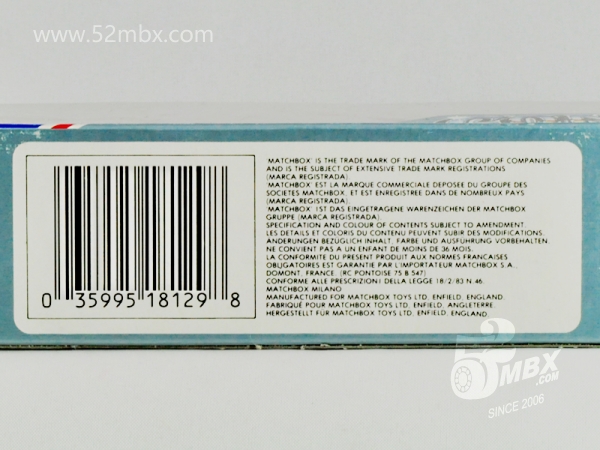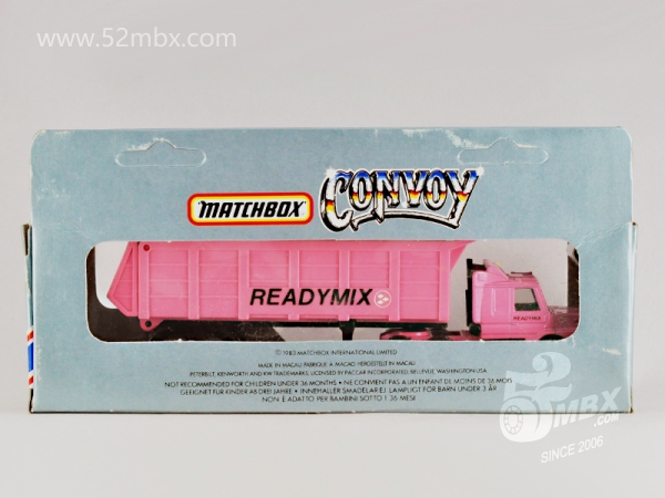 涂装序号/Variation #: 001![]() 制造商信息/Company name: Matchbox Int'l Ltd. MB标志样式/Logo style: ![]() 产地/Origin(s): 澳门环球 (Macau) 版权年代/Year on base: 1985 1986年6月仅在澳洲发行的Readymix涂装 图片提供者/Picture by: chenly75,上传时间/Updated: 2016-10-20