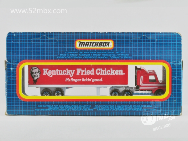 涂装序号/Variation #: 016![]() 制造商信息/Company name: Matchbox Int'l Ltd. MB标志样式/Logo style: ![]() 产地/Origin(s): 澳门环球 (Macau) 版权年代/Year on base: 1985 1987年8月仅在英国地区发行的肯德基(KFC)涂装,总第16种CY16涂装。 图片提供者/Picture by: chenly75,上传时间/Updated: 2016-11-10