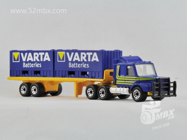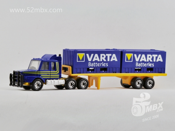 ![]() 图片提供者/Picture by: chenly75 最后更新/Updated: 2017-05-16 车头/Cab: MB147 Scania T142 挂车/Trailer: Double Container Truck 版权年代/Year on base: 1985 比例/Scale: 1:90 底盘标注/Marked on base 制造商信息/Company name: Matchbox Int'l Ltd. Matchbox标志样式/Logo style: ![]() 产地/Origin(s): 澳门环球 (Macau) | | |||