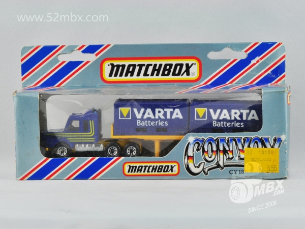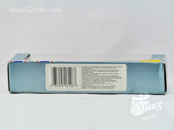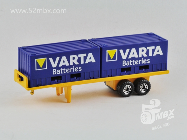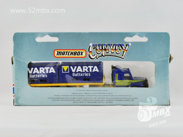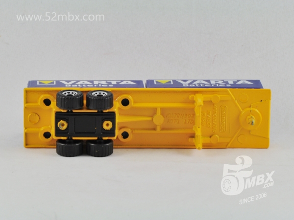 涂装序号/Variation #: 001![]() 制造商信息/Company name: Matchbox Int'l Ltd. MB标志样式/Logo style: ![]() 产地/Origin(s): 澳门环球 (Macau) 版权年代/Year on base: 1985 1986年发行的首版涂装:Vatra Batteries(瓦尔塔蓄电池)。 图片提供者/Picture by: chenly75,上传时间/Updated: 2017-05-16