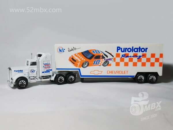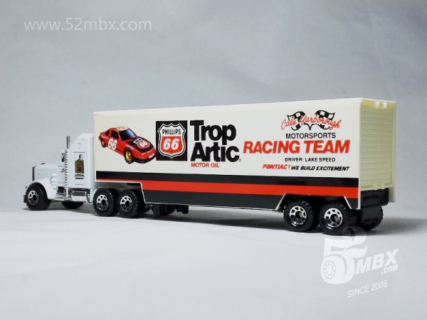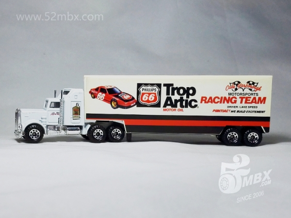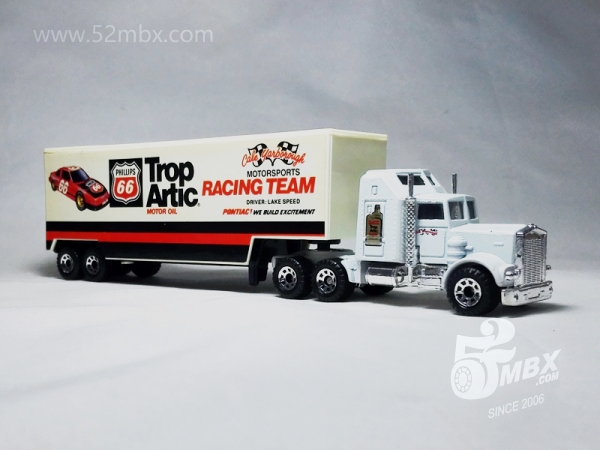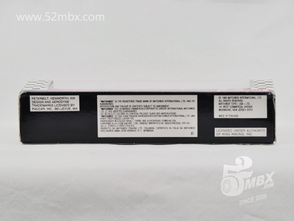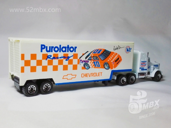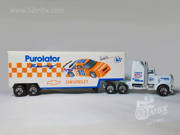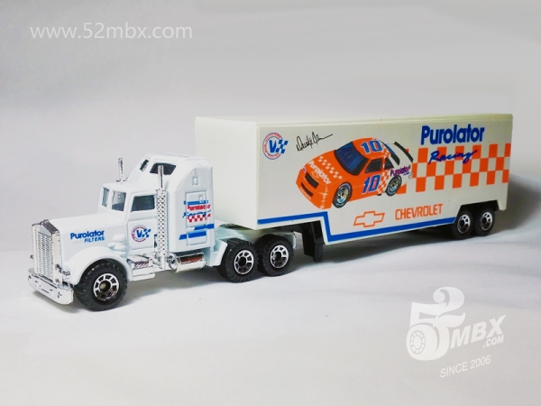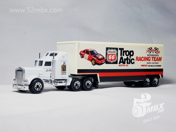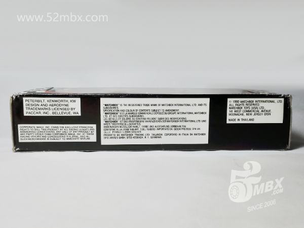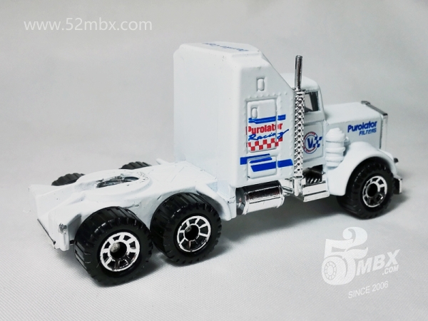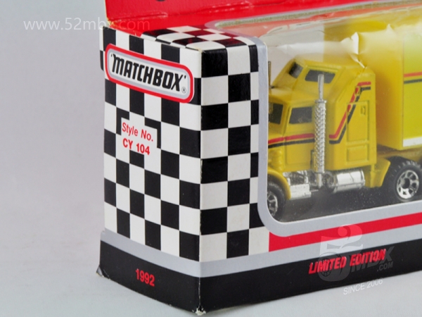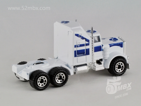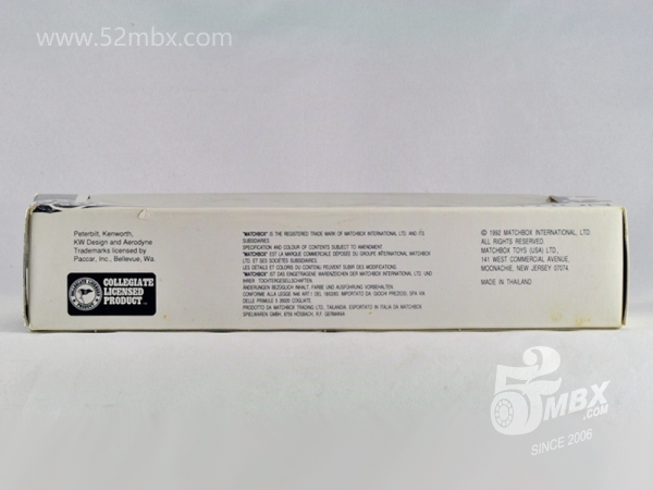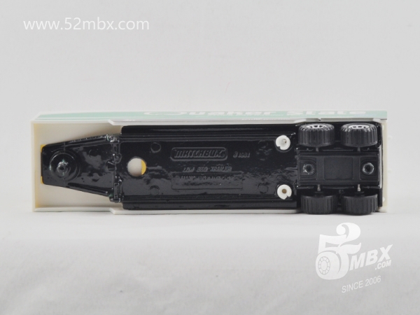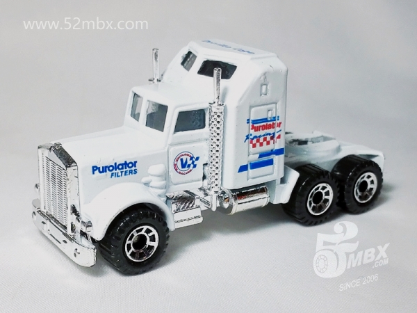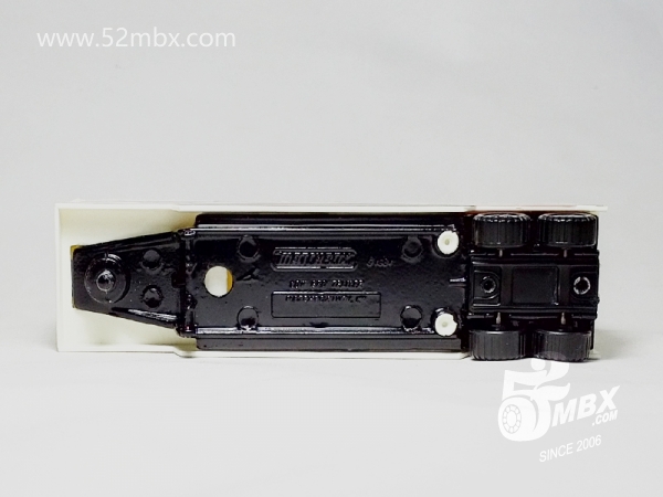 ![]() 图片提供者/Picture by: chenly75 最后更新/Updated: 2016-12-22 车头/Cab: MB103 Kenworth W900 Aerodyne 挂车/Trailer: Removal Truck 版权年代/Year on base: 1983 比例/Scale: 1:100 底盘标注/Marked on base 制造商信息/Company name: Matchbox Int'l Ltd. Matchbox标志样式/Logo style: ![]() 产地/Origin(s): 澳门环球 (Macau) | 泰国 (Thailand) | | |||