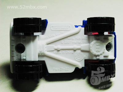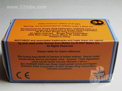 版权年代/Year on base: 2007 比例/Scale: 无/None 底盘未标注/Not marked on base 底盘编号/Number on base: 281 Matchbox标志样式/Logo style: ![]() 制造商信息/Company name: Mattel, Inc. 产地/Origin(s): 南海官窑 (China - Guanyao) | 其它信息/Others: MFG. FOR BKC. with Burger King logo 该车并非火柴盒常规系列产品,不属于MAN编号体系,没有官方制定的MB编号。该车是美泰公司利用自己开发的MB569模具专为汉堡王(Burger King)®改造的随餐赠送礼品车,最早于2007年在南海官窑生产,目前已知仅有中国版。塑料底盘无避震,半透明车窗无内饰,车顶后部由车窗遮盖,内无备胎。前脸保险杠下部取消MB569的镂空设计,改之为塑料整体。底盘铭文为汉堡王特制,除汉堡王标志和授权信息以外,还包括一般火柴盒产品都具有的信息,包括年代、火柴盒商标和美泰制造。底盘编号FW-01-02,后轴中部有蚀刻编号281。 最后更新/Updated: 2013-11-26 | |||