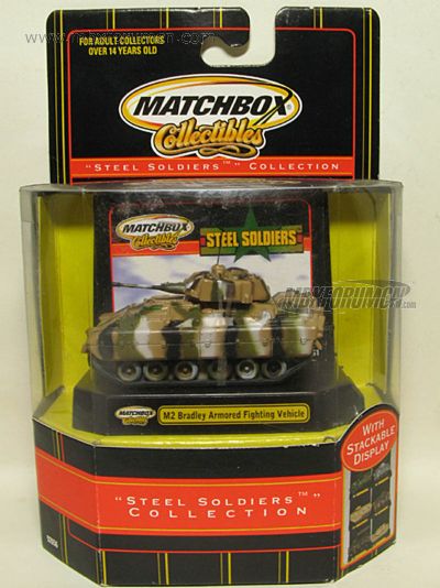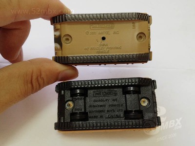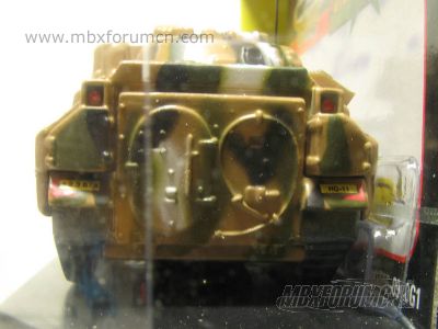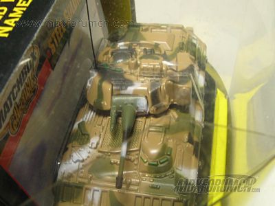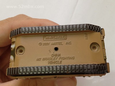 版权年代/Year on base: 2001 比例/Scale: 1:98 底盘标注/Marked on base Matchbox标志样式/Logo style: ![]() 制造商信息/Company name: Mattel, Inc. 产地/Origin(s): 南海官窑 (China - Guanyao) | 该车并非火柴盒常规系列产品,不属于MAN编号体系,没有官方指定的MB编号。美国资深火柴盒收藏家Charlie Mack编著的《火柴盒百科全书第3版》(2004)将该车编入Feature Cars系列。该车是由美泰公司在MB323基础上重铸底盘及履带车轮并添加细节后的精品车,仅于2001年在美国地区发行。该车为全合金制造,炮塔右侧增加了天线和机枪,底盘取消了MB323上的隐藏式可活动小轮。(数据库基本资料图片提供者:MB017132,特此表示感谢!) 最后更新/Updated: 2014-08-01 | |||