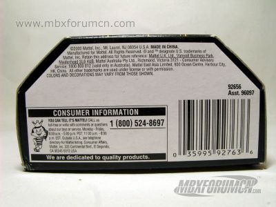 涂装序号/Variation #: 001![]() 制造商信息/Company name: Mattel, Inc. MB标志样式/Logo style: ![]() 产地/Origin(s): 南海官窑 (China - Guanyao) 版权年代/Year on base: 2001 2001年发行的唯一涂装。 图片提供者/Picture by: MB017132,上传时间/Updated: 2014-07-31